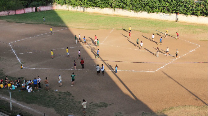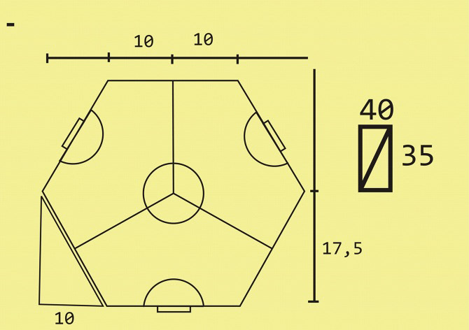 Campo de futebol de três lados em formato hexagonal, onde três times jogam ao mesmo tempo. Na década de 1960, o situacionista dinamarquês Asger Jorn criou um jogo chamado Futebol de 3 lados (3sided football/ Triolektisk fodbold), no qual não dois, mas três times deveriam se enfrentar em um campo de formato hexagonal, colaborando mais do que competindo, concordando entre si a respeito do que é e o que não é permitido, ao invés de serem controlados por uma força externa.